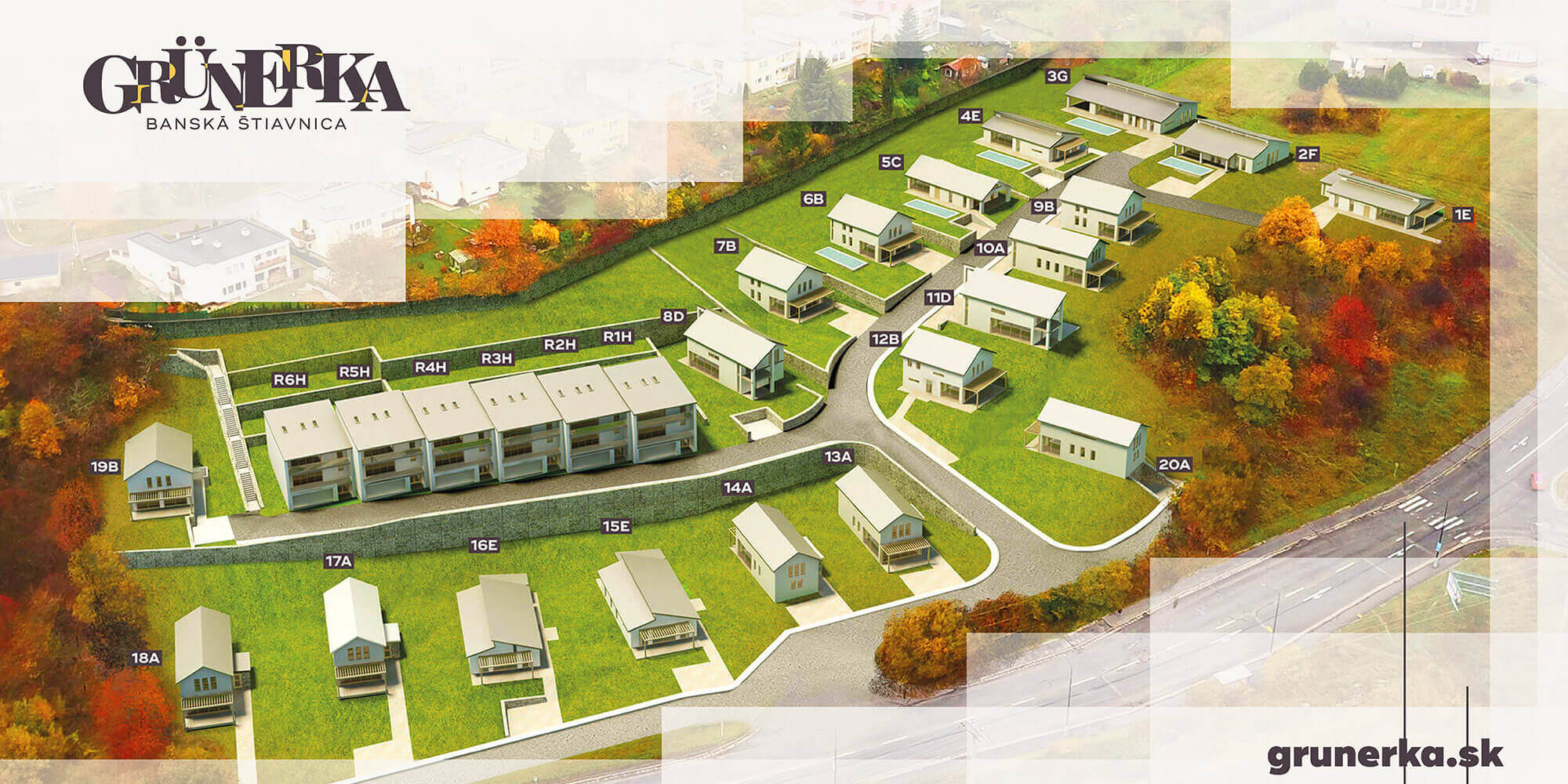 Projekt Grünerka v Banskej Štiavnici ponúka 26 moderných domov v pasívnom štandarde, situovaných v srdci prírody a zároveň na dosah historického centra mesta. Názov projektu odkazuje na zlatú žilu "Grüner", ktorá sa nachádza priamo pod obytnou zónou, čím dodáva miestu jedinečný charakter.